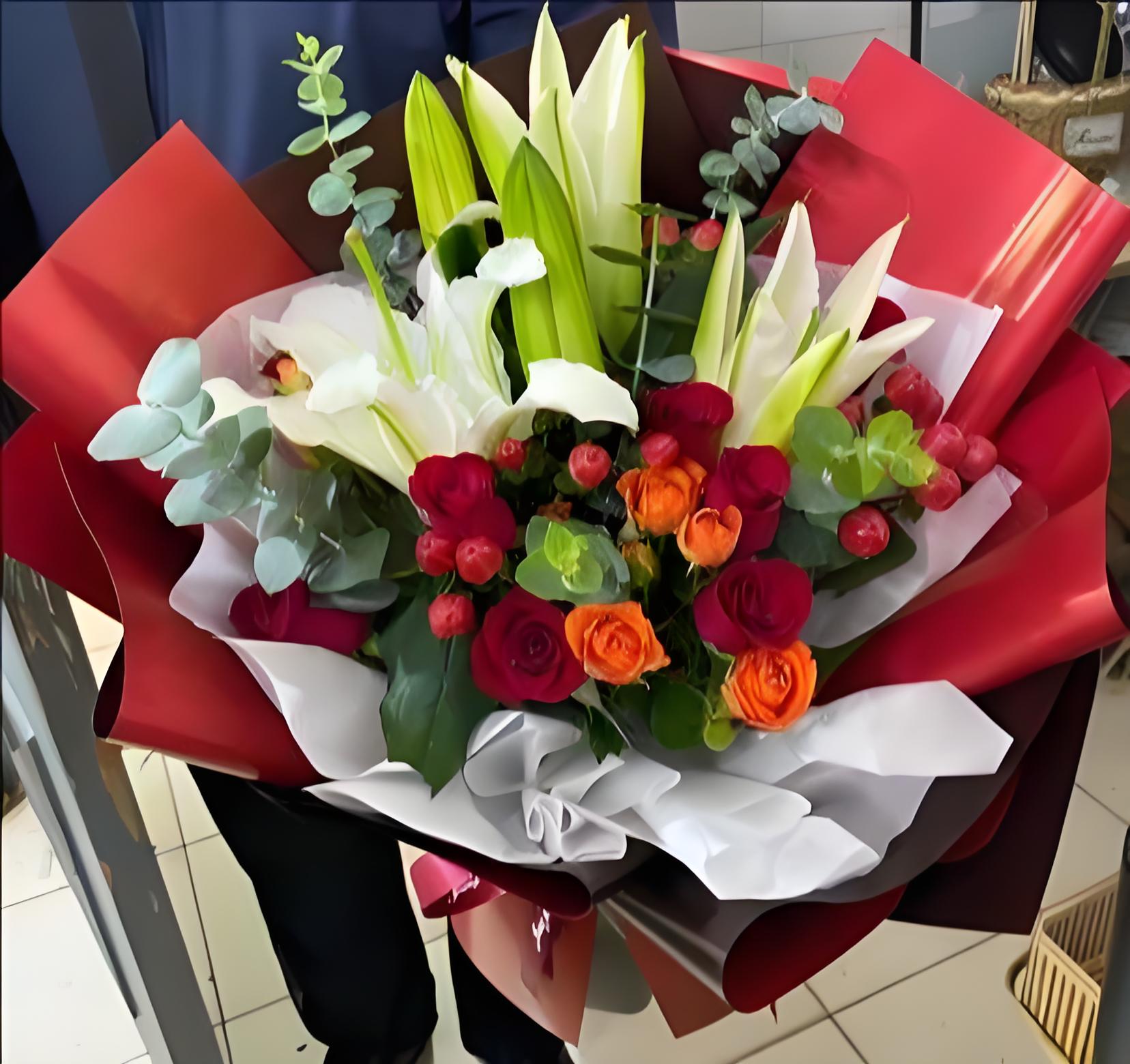 锦州北镇市花店包11枝红玫瑰、2枝多头白百合、6枝橙色多头玫瑰、红豆、尤加利叶